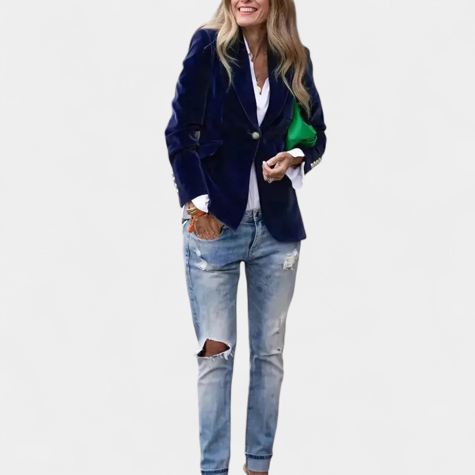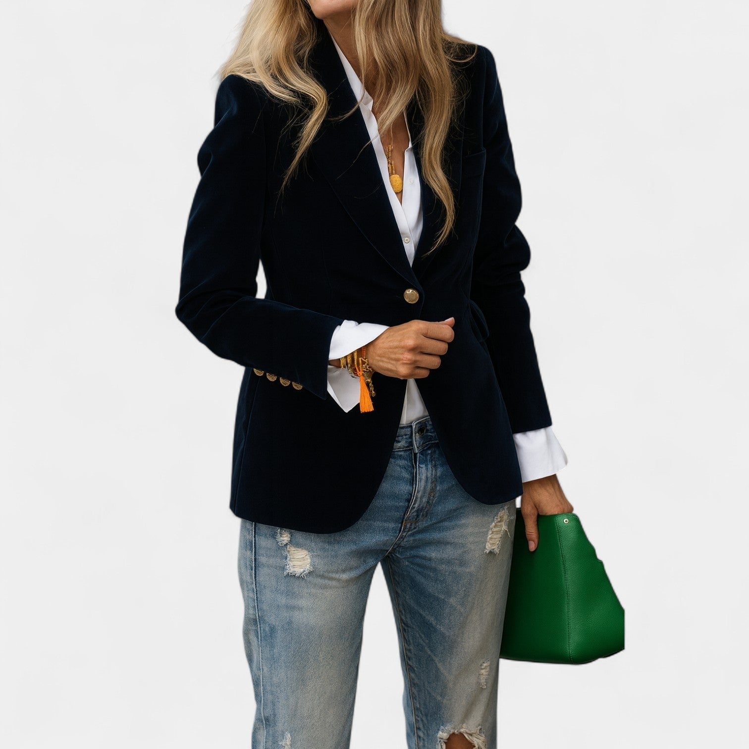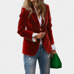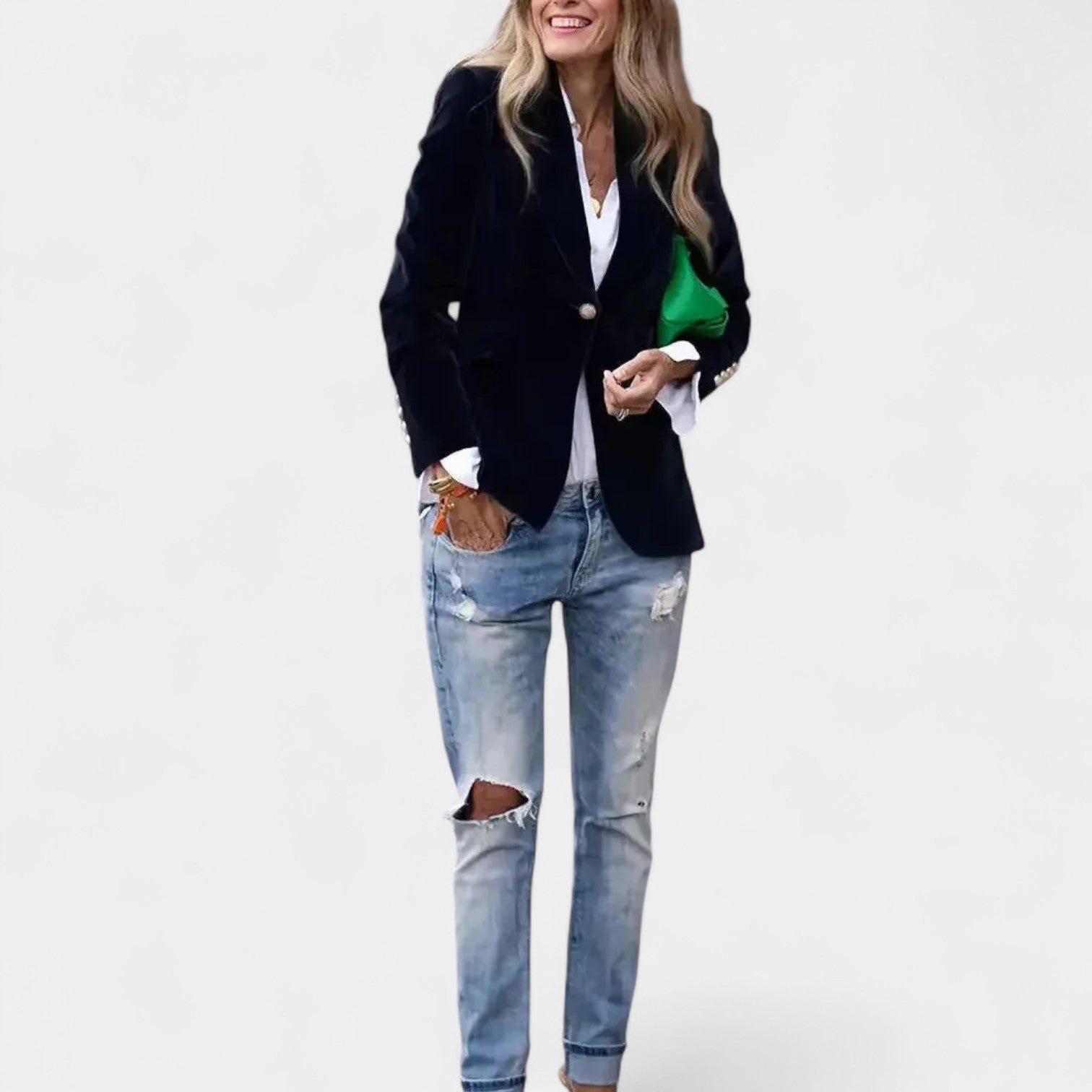 Sako Andrea z nežnim sametnim površjem je popoln kos za ženske, ki želijo delovati elegantno in samozavestno v vsaki situaciji. Zaradi natančnega kroja z enojnim zapenjanjem, ostrimi klapami in nežno ojačanimi rameni ustvarja laskavo silhueto, ki se prilega tako kavbojkam kot tudi bolj elegantnim oblekam. Zlati gumbi na rokavih dodajajo celoti sofisticiran detajl.