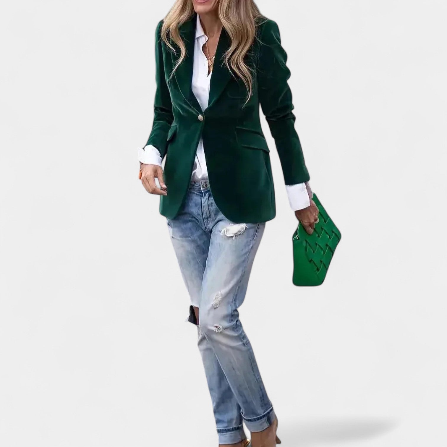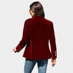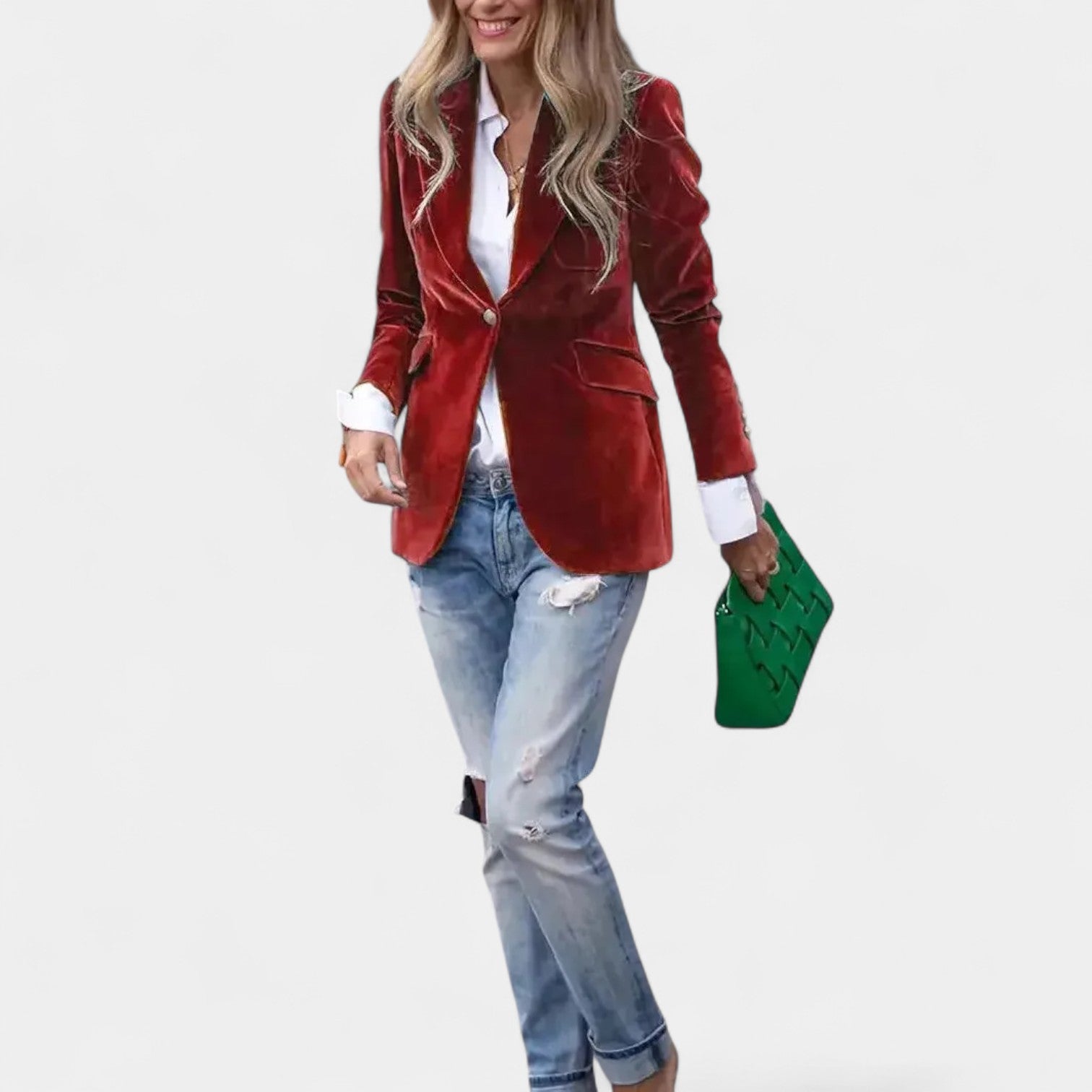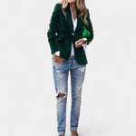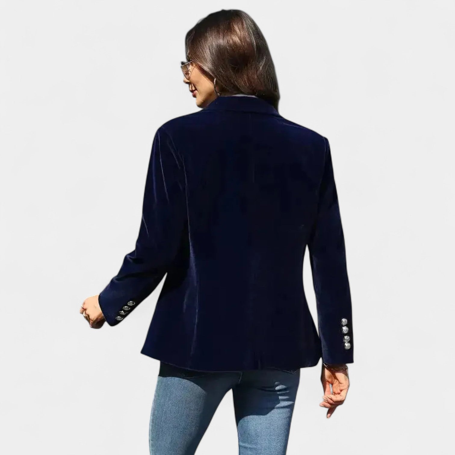 Sako Andrea z nežnim sametnim površjem je popoln kos za ženske, ki želijo delovati elegantno in samozavestno v vsaki situaciji. Zaradi natančnega kroja z enojnim zapenjanjem, ostrimi klapami in nežno ojačanimi rameni ustvarja laskavo silhueto, ki se prilega tako kavbojkam kot tudi bolj elegantnim oblekam. Zlati gumbi na rokavih dodajajo celoti sofisticiran detajl.